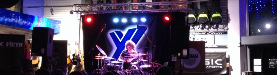 Full house. The X-Music shop floor was the venue for what was to be an impressive display of some of the most intelligent drumming I’ve seen yet. Jojo’s impressively neat kit was already set up on a riser and the seats were laid out. The merchandise counter had a steady stream of punters ready to buy his instructional DVDs, custom kick pedal, branded sticks and other lovely drum porn.